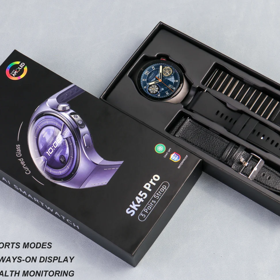 Equipped with a 1.53” IPS HD display (360×360 resolution), the SK45 Pro offers crystal-clear visuals and a customizable dial interface. With Bluetooth 3.0/5.3 support, you can enjoy hands-free calls, message reminders, and AI voice assistant access right from your wrist.